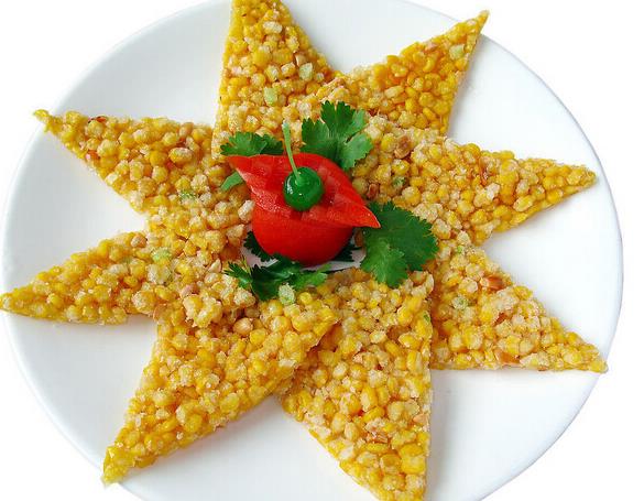【黄金玉米烙】1.玉米洗净煮10分钟捞出晾凉取粒;2.玉米粒中倒干淀粉拌匀;3.取平底锅烧热锅底放油,倒入玉米粒推平;4.小火煎5分钟,小心底部焦掉;5.煎至成型不散开再倒油,没过玉米饼;6.开中火油升温至7成,炸至玉米饼金黄酥脆关火倒出油,玉米饼撒上白糖出锅。