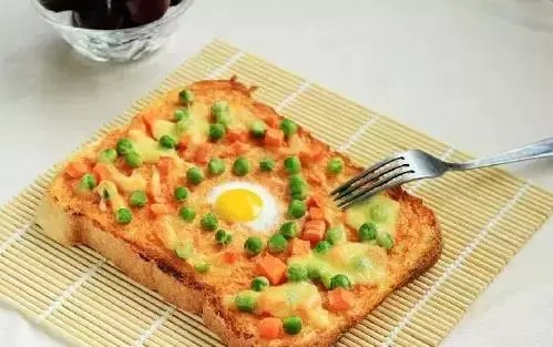 吐司片(2片)、鹌鹑蛋(2只)、青豆(50克)、胡萝卜(50克)