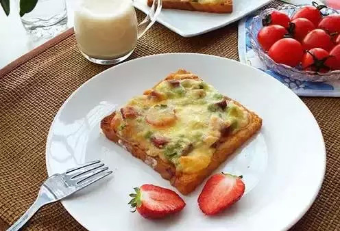 6、将做好的吐司披萨放在烤盘里,烤箱180度预热5分钟,上下烤7分钟至蛋熟