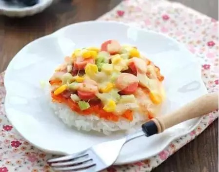 米饭、火腿、芹菜、洋葱、玉米粒、披萨酱、马苏里拉奶酪