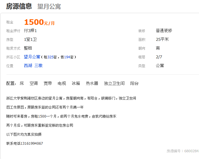 » 浙大紫荆港,朝南,押一付一1500