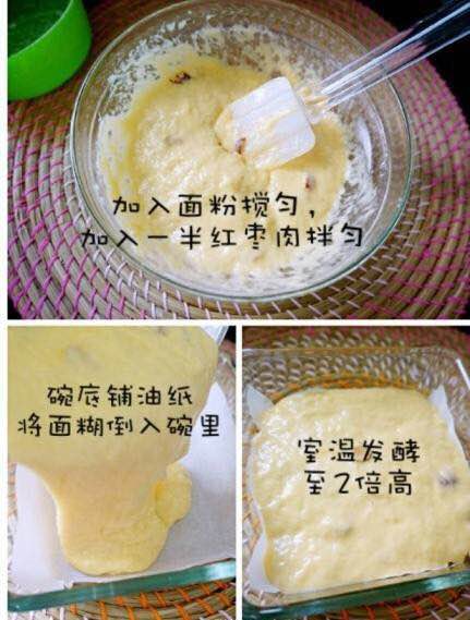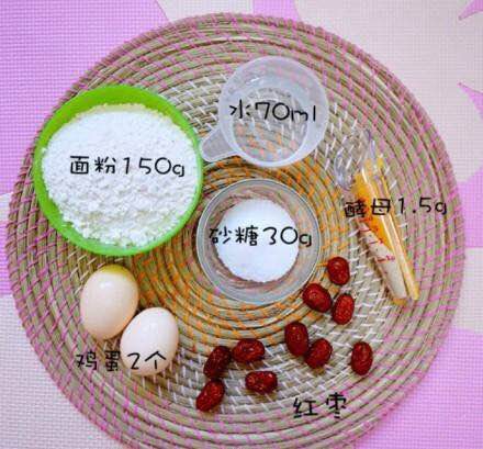 面粉150g,水70ml,鸡蛋2个,砂糖30g,酵母1.5g,红枣若干~