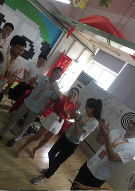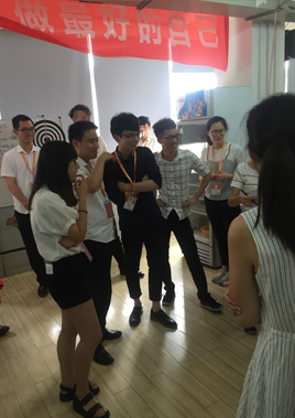 今天游戏来点考眼力耳力的,对面四个人同时说一个成语,一人说一个字,让大家猜。平时电视里看看一直以为挺简单的,真到自己去猜还真没那么容易的,小伙伴们分成六组,各自讨论计策,别看就这个小小的游戏,原来也是要技巧的,就如平常工作一样,同样都是打电话,为什么人家可以一打轻轻松松达标,而你每天只会抱怨太难,是不是用错办法呢了