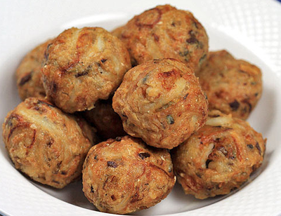 锅里加油,烧至5成热,将银鱼球入锅,炸熟。然后大伙再炸一下,表面炸脆,就可以出锅了。