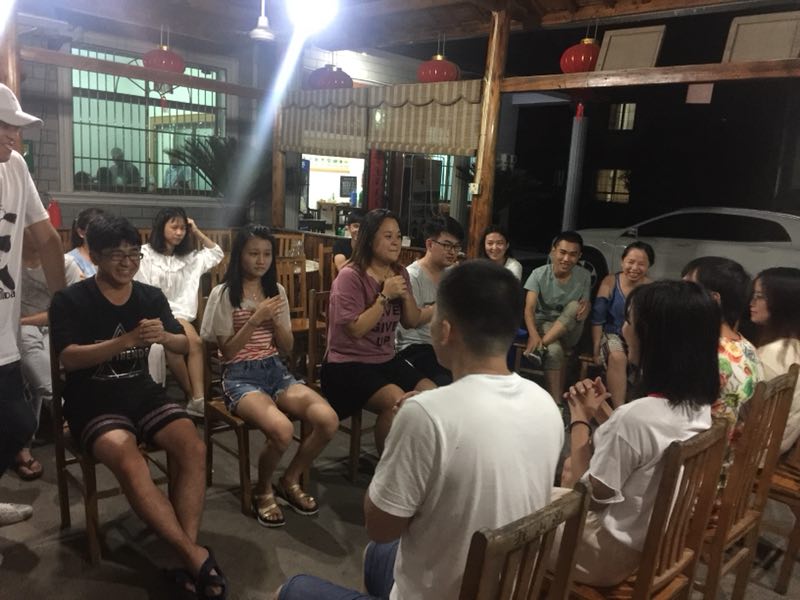 夜幕降临,吃饱喝足的小伙伴们进行饭后娱乐活动,大家围成一个圈,