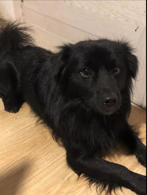 :耳朵耷拉下来的,毛色黑色,胸前毛白色,左后脚尖白毛,尾巴向上卷成一个圆