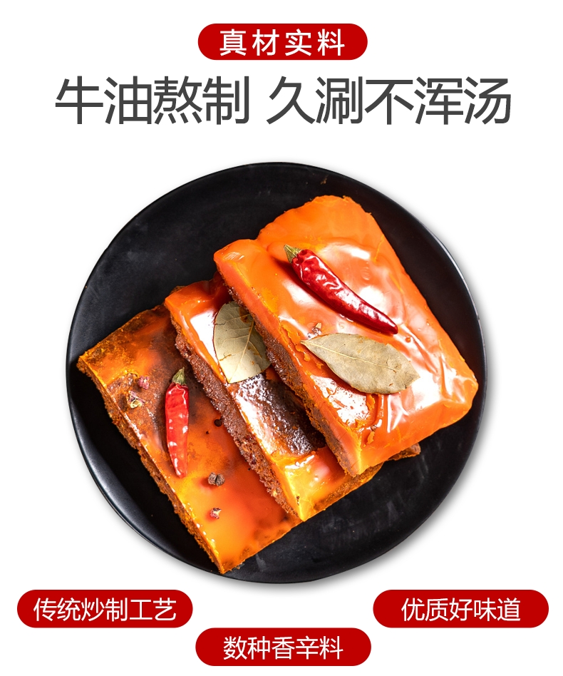 原油采用牛板油,牛油脂香味更加浓厚,味道更好。