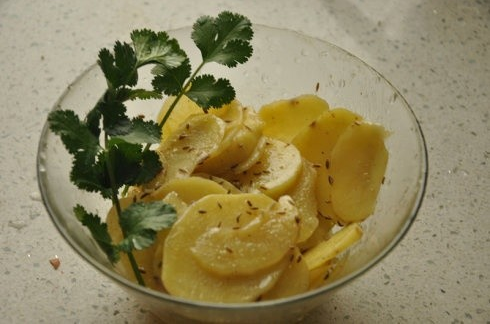1.把土豆洗净、去皮、切薄片(越薄越好)。切好的土豆片一定要在第一时间泡在冷水里,这样才能保持它黄橙橙的美样,不然土豆里面的淀粉很快就被空气氧化变了颜色。