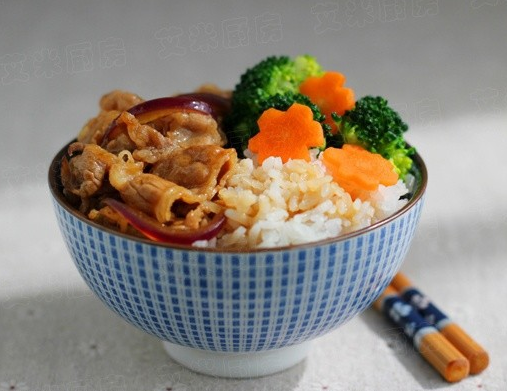 8.将肥牛片,洋葱丝,胡萝卜和西兰花摆在米饭上,再淋上汤汁就可以了。