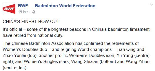 » 一个时代落幕! 王适娴等五女将退出中国羽毛球队