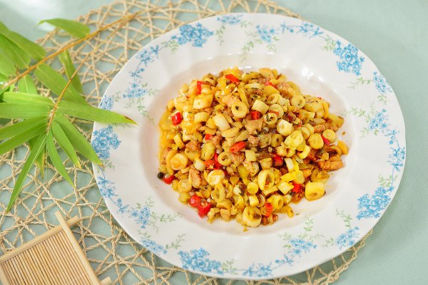 3、锅内放用,下肉末煸香,下红椒米、酸菜、小笋,调入盐、味精翻炒,淋香油,撒上葱花即成。