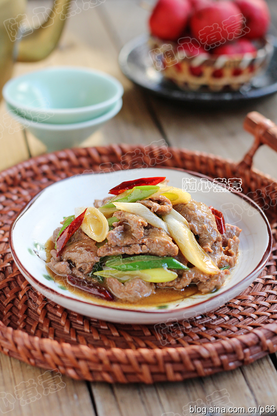 4.锅烧热倒入油,放入姜片、蒜片和干辣椒段爆香,转大火,放入羊肉快速炒散,羊肉变色熟透后,放入大葱翻炒断生,最后淋入调味汁快速翻炒均匀即可出锅。
