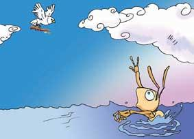 这时,路边走来一个捕鸟人,他看见了树上的鸽子,立刻撒开捕鸟网。他正在得意地以为万无一失时,蚂蚁觉察到了,爬上去朝他的手狠狠地咬了一口。捕鸟人痛得松开了手,他手里的网张开了,鸽子连忙从罗网中逃脱,飞向了天空。