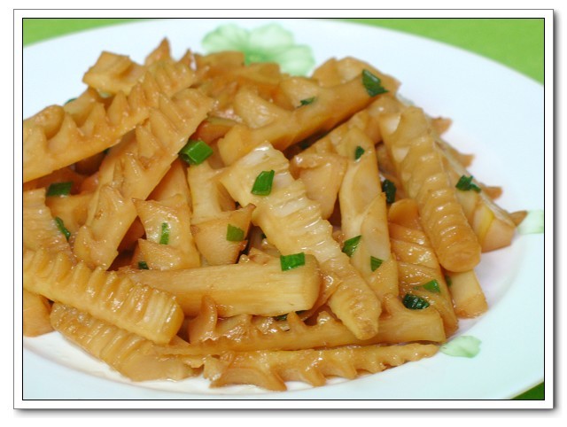 春笋200克,酱油25克,白砂糖20克,味精15克,盐5克,植物油50克。将春笋切成5厘米长的条,把油锅烧至七成热,将春笋倒入拉油至春笋水分基本收干后倒出。锅留底油烧热倒入春笋,再加老抽,糖,味精和适量水,用小火焖烧至水分基本收干后,淋些明油装盘即可。