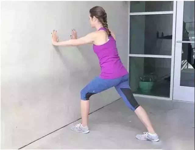 站在距墙一臂的距离,将右脚放在左脚后,左膝伸直的同时保持右脚后跟触地,缓慢向前弯曲左腿。后背挺直并收臀。脚指向正前方。保持30-45秒。换腿重复。