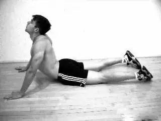 髋部、大腿的股四头肌、膝盖、小腿、脚背完全紧贴地面,双手臂放于胸肌下方伸直将上半身撑起,收腹抬头,感觉腹部肌肉被拉伸。保持20-30秒。