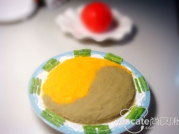 2.锅上火滑油.下猪油放一半土豆泥,加菠菜汁、白糖炒成甜味;另一半加精盐、味精炒成咸味。两味成太极图形装入盘内即可。