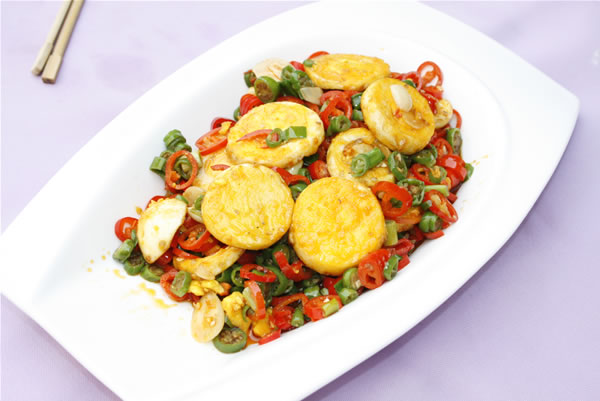 增值招聘专员 黄佳娜(文)2018年7月30日   湖南蛋又叫金钱蛋,是一道美味可口的传统名菜,属于湘菜系油炸食品。此菜是用煮好的鸡蛋切片经过炸制和爆炒而成,做成的鸡蛋黄灿灿,加上辣椒们得搭配,色泽艳丽,显示出一片喜庆的好彩头。鸡蛋经过煎炸和爆炒,表皮焦脆,里层质嫩,结合辣椒味道,口味层次丰富。 鸡蛋 3个、红尖椒 2个、青杭椒3个、蒜瓣 3个、油 适量、盐 适量、酱油 少许。