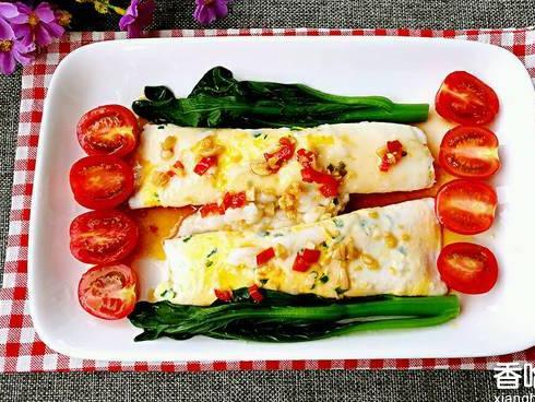 11:最后摆盘的时候,加入开水烫好的菜心,以及一些圣女果做装饰,再淋入做好的酱料,一份色香味俱全的肠粉就做好啦。