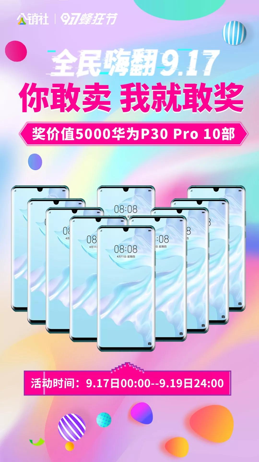 “917蜂狂节”活动期间(9月17日0:00-9月19日23:59)社长自购+推广大众商品销售额(累计订单实付金额)前10名奖励AI音箱一个,前10名中若金额达到8万元以上者可再获得价值5000元的华为P30 Pro 128G;另社长自购+推广大众商品销售额(累计订单实付金额)达到一定销量即可获得30-300元无门槛粮票(粮票面值10-50元)。